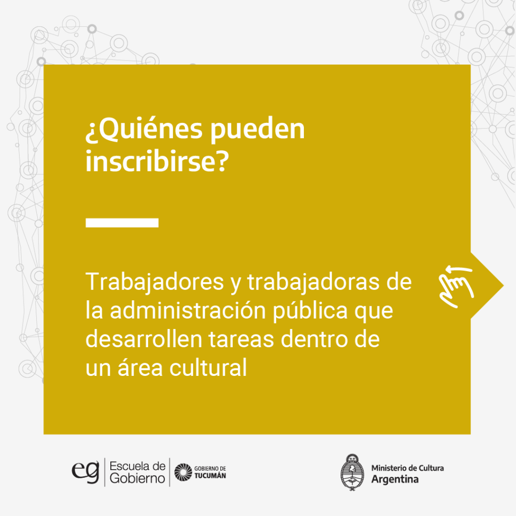 Trabajadoras y trabajadores de los diferentes niveles de la administración pública nacional, provincial, municipal y universitaria, cuya área de trabajo esté vinculada al ámbito cultural y que no hayan participado de ediciones anteriores del programa. Tiene un cupo limitado para la participación de 50 personas por cada una de las seis regiones del país: en el NOA se articula a través de la Escuela de Gobierno de la Provincia de Tucumán (la región abarca a la provincias de Catamarca, La Rioja, Jujuy, Salta, Santiago del Estero y Tucumán).