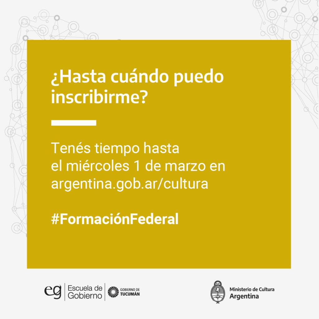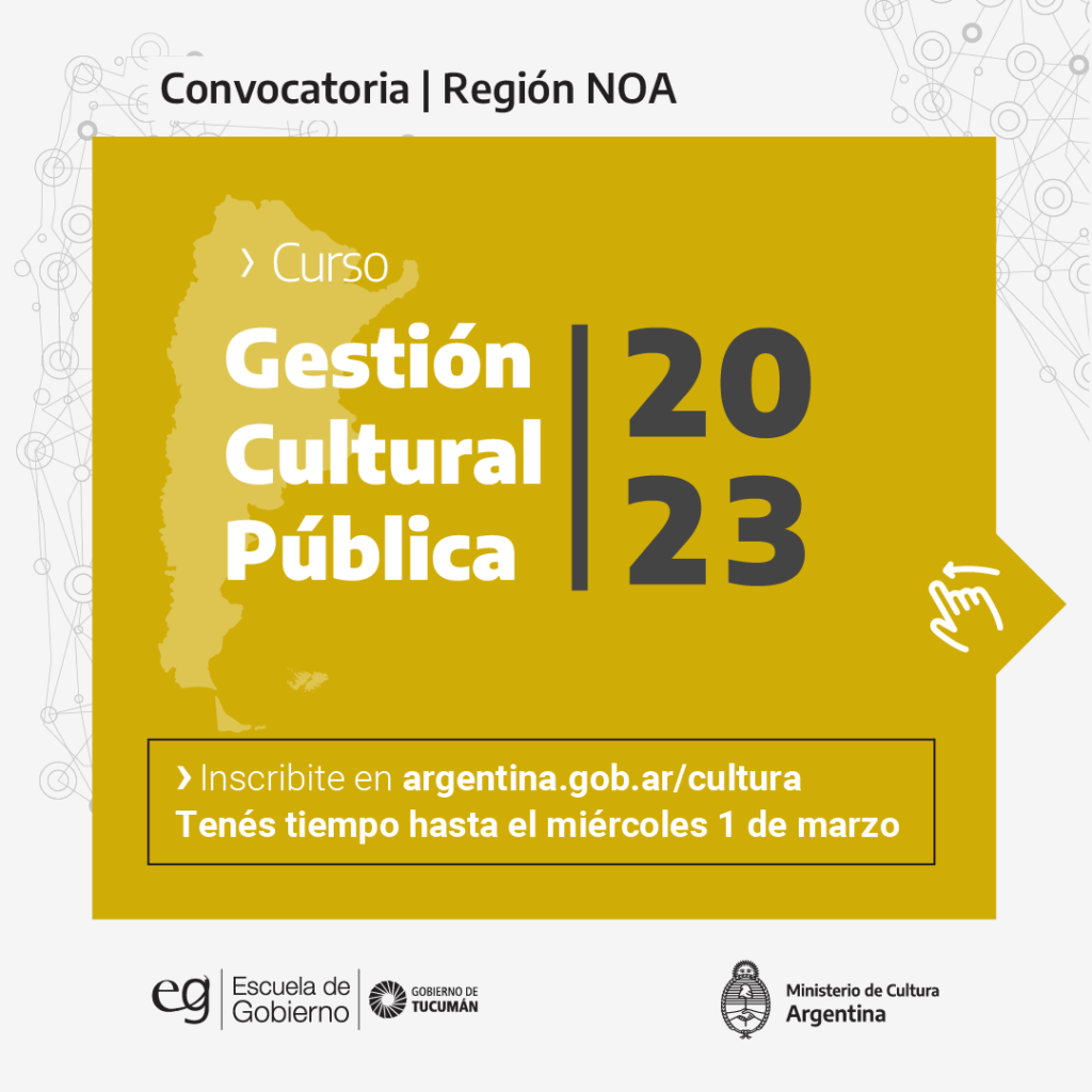 El Ministerio de Cultura de la Nación, a través de la Dirección Nacional de Formación Cultural perteneciente a la Secretaría de Gestión Cultural, abre nuevamente la convocatoria al curso en Gestión Cultural Pública 2023. Se trata de la primera edición del año 2023 con una iniciativa de capacitación en modalidad virtual que tiene por finalidad contribuir a la profesionalización de gestores/as culturales de todos los niveles de la administración pública en las seis regiones del país.