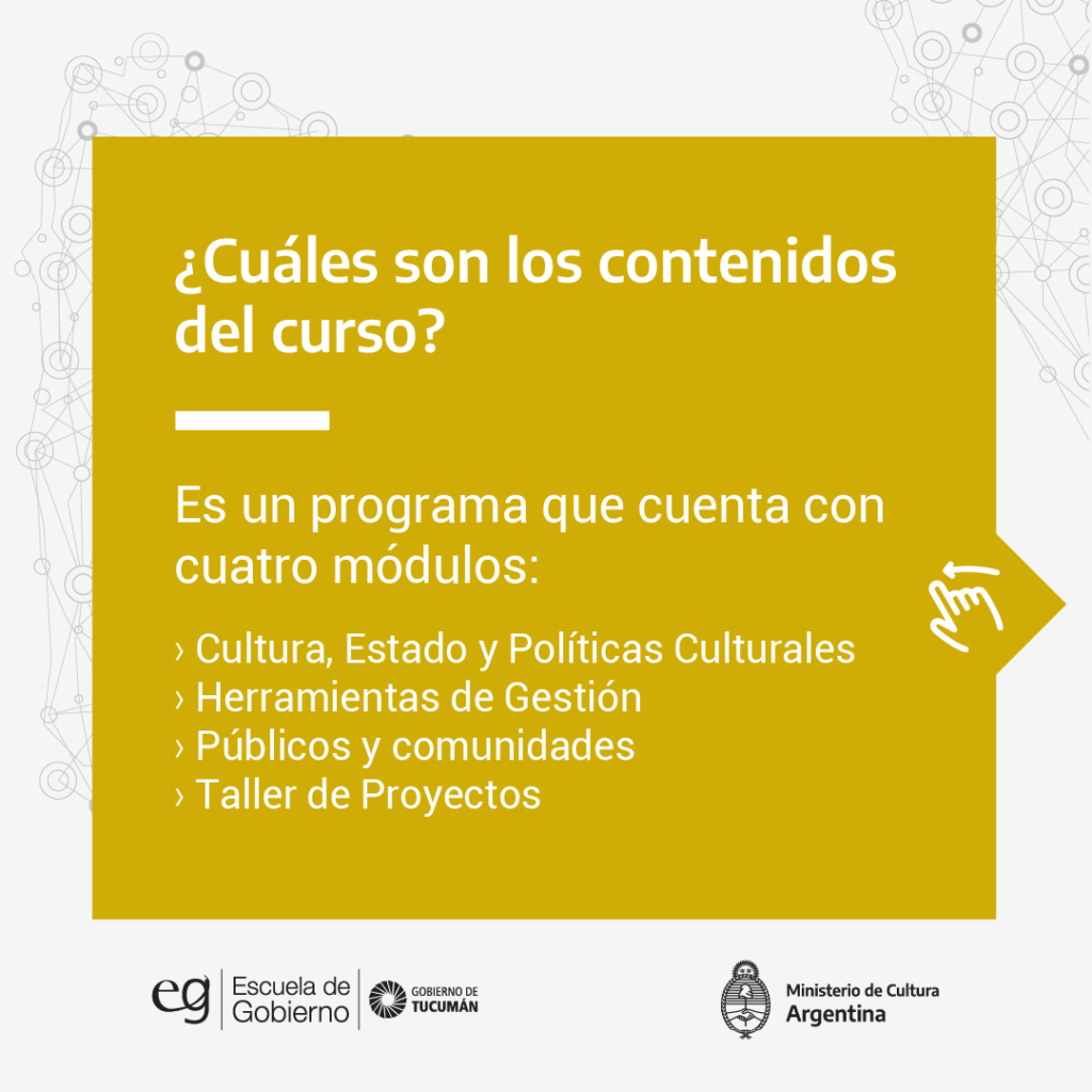 El curso está compuesto por cuatro módulos a cargo de distintos especialistas, cada módulo busca contextualizar y problematizar los alcances de la gestión cultural pública desde diversas perspectivas: