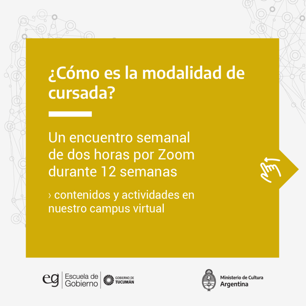 DURACIÓN DEL CURSO La cursada tiene una duración de 12 semanas. Está estructurada en grupos por cada región y requiere la asistencia a encuentros sincrónicos semanales con especialistas. Además, implica la visualización y lectura de materiales asincrónicos, la participación en espacios de debate y la elaboración de un proyecto como trabajo final. Se estima una dedicación semanal aproximada de 5 horas.